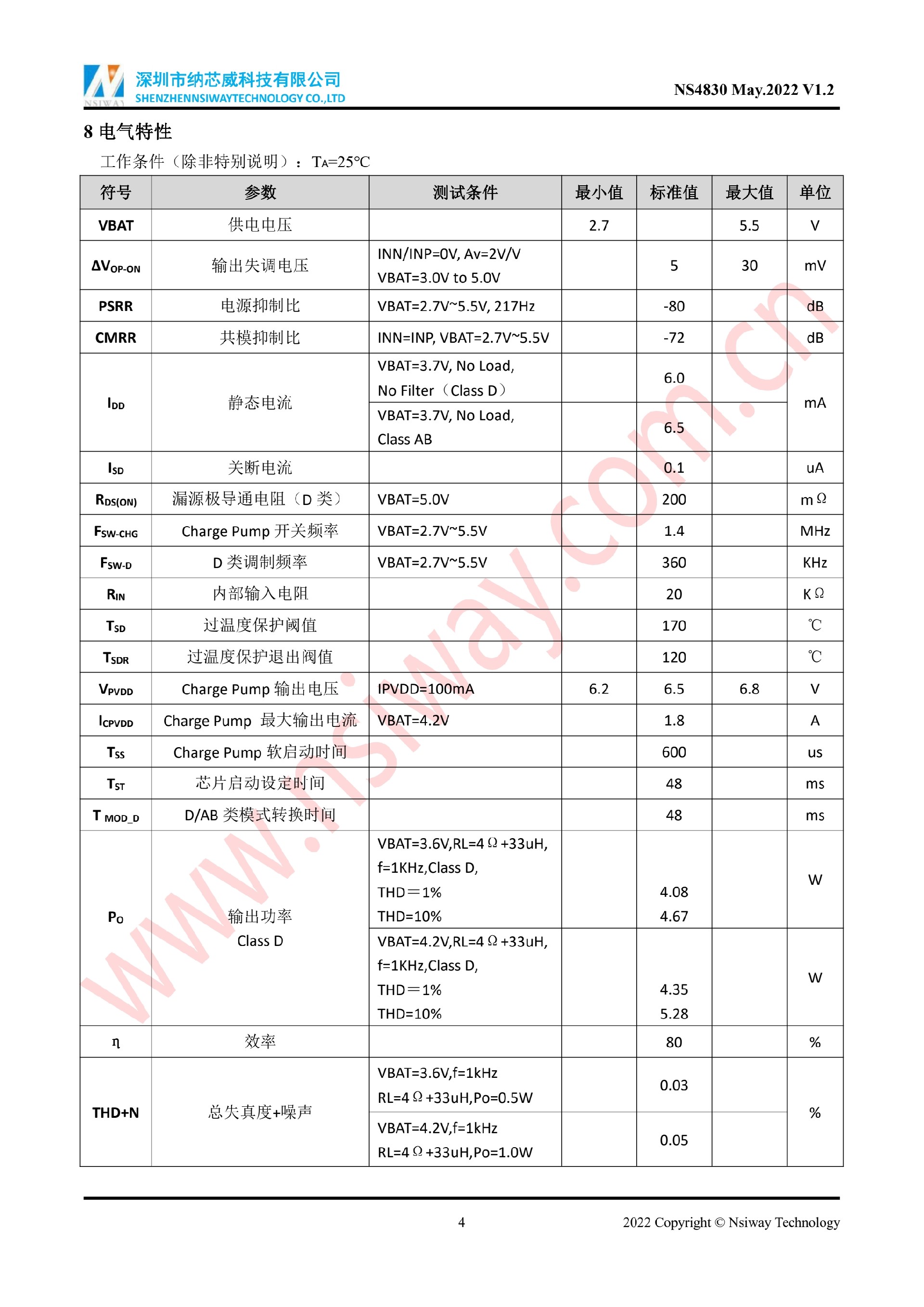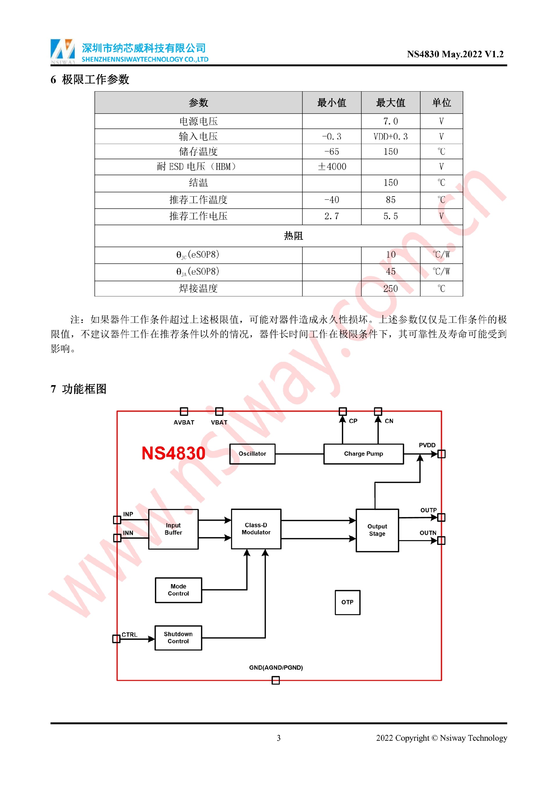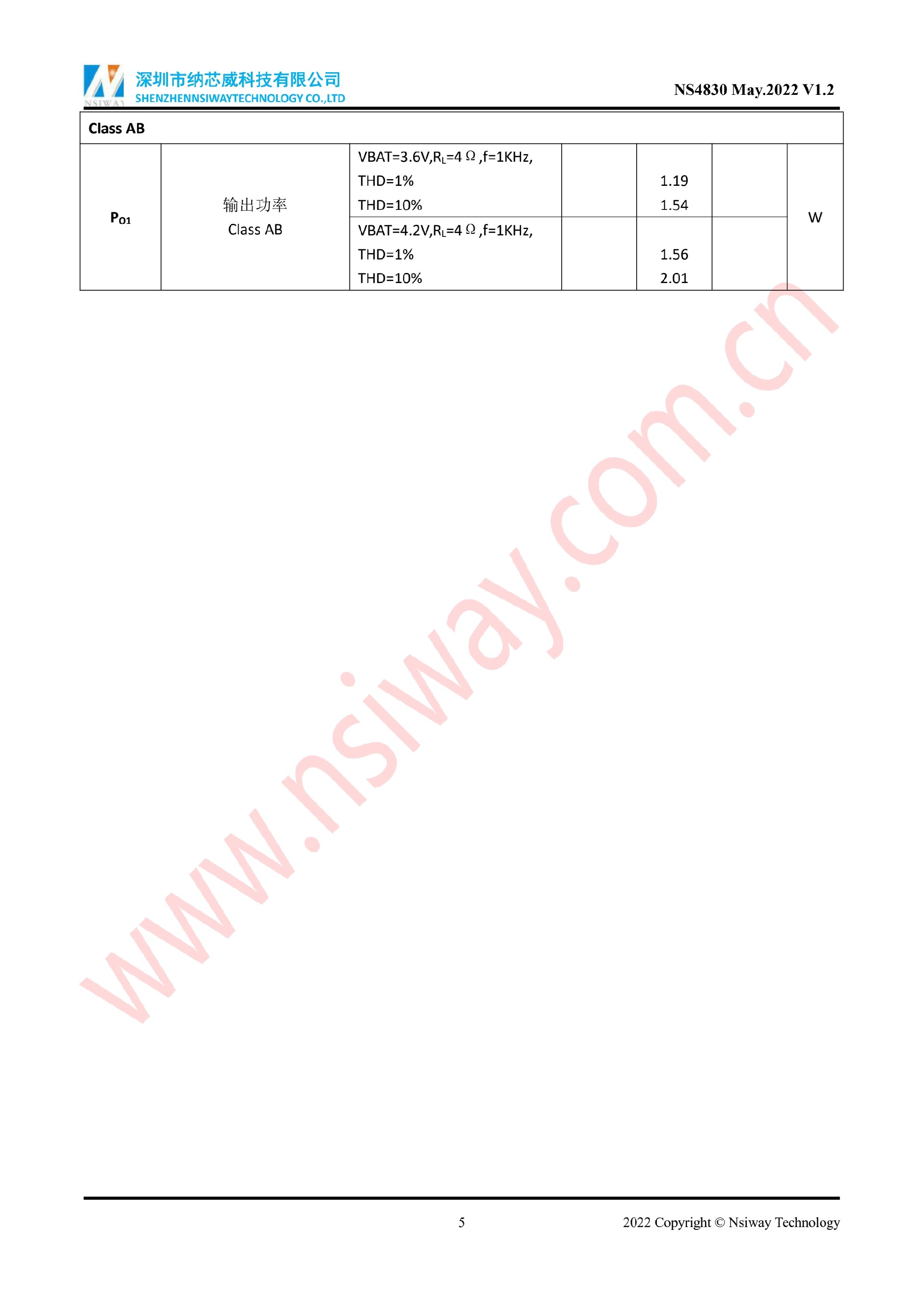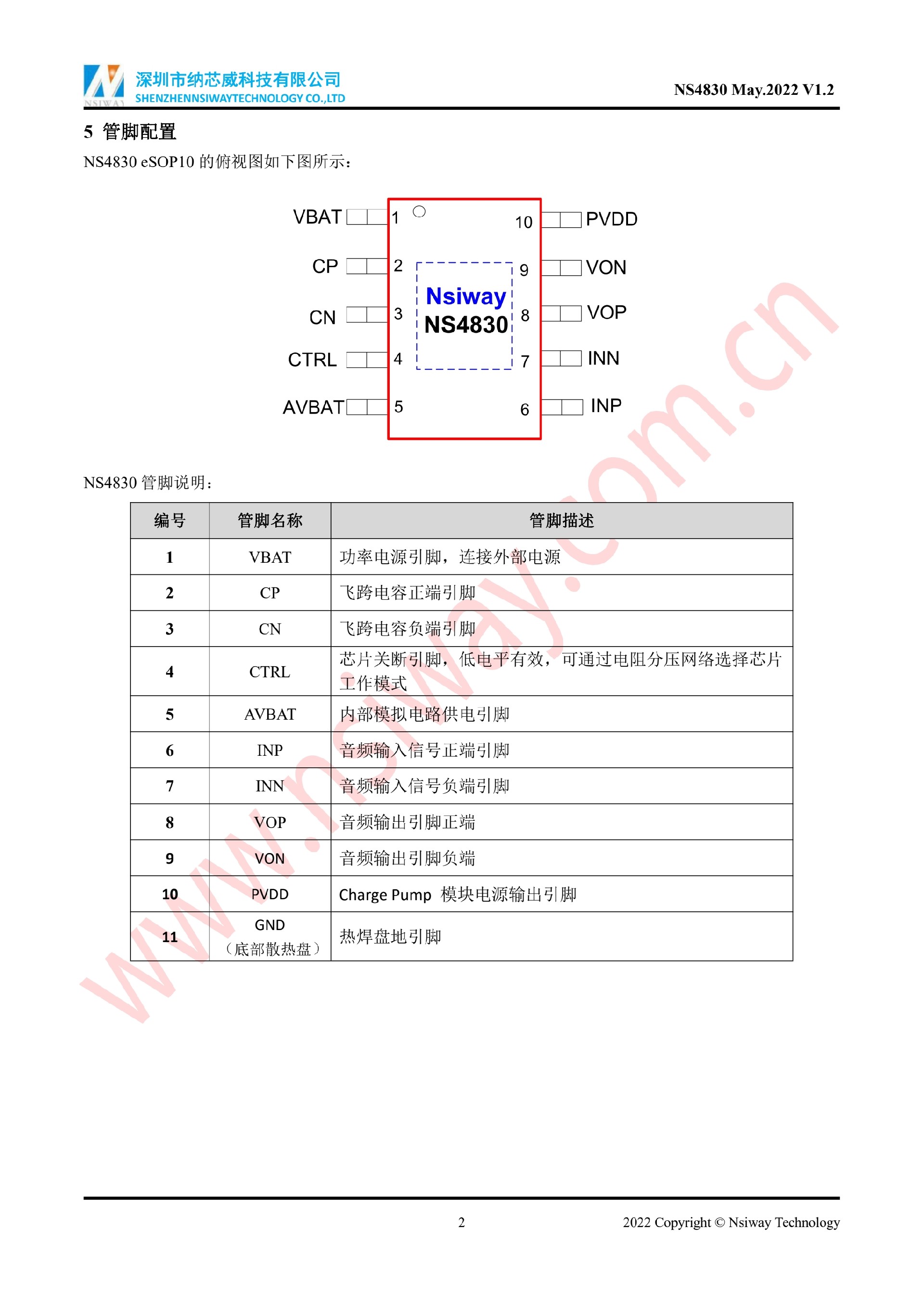 NS4830 5.3W 單聲道AB/D類音頻功率放大器附加自適應Charge Pump升壓模塊(eSOP-10)