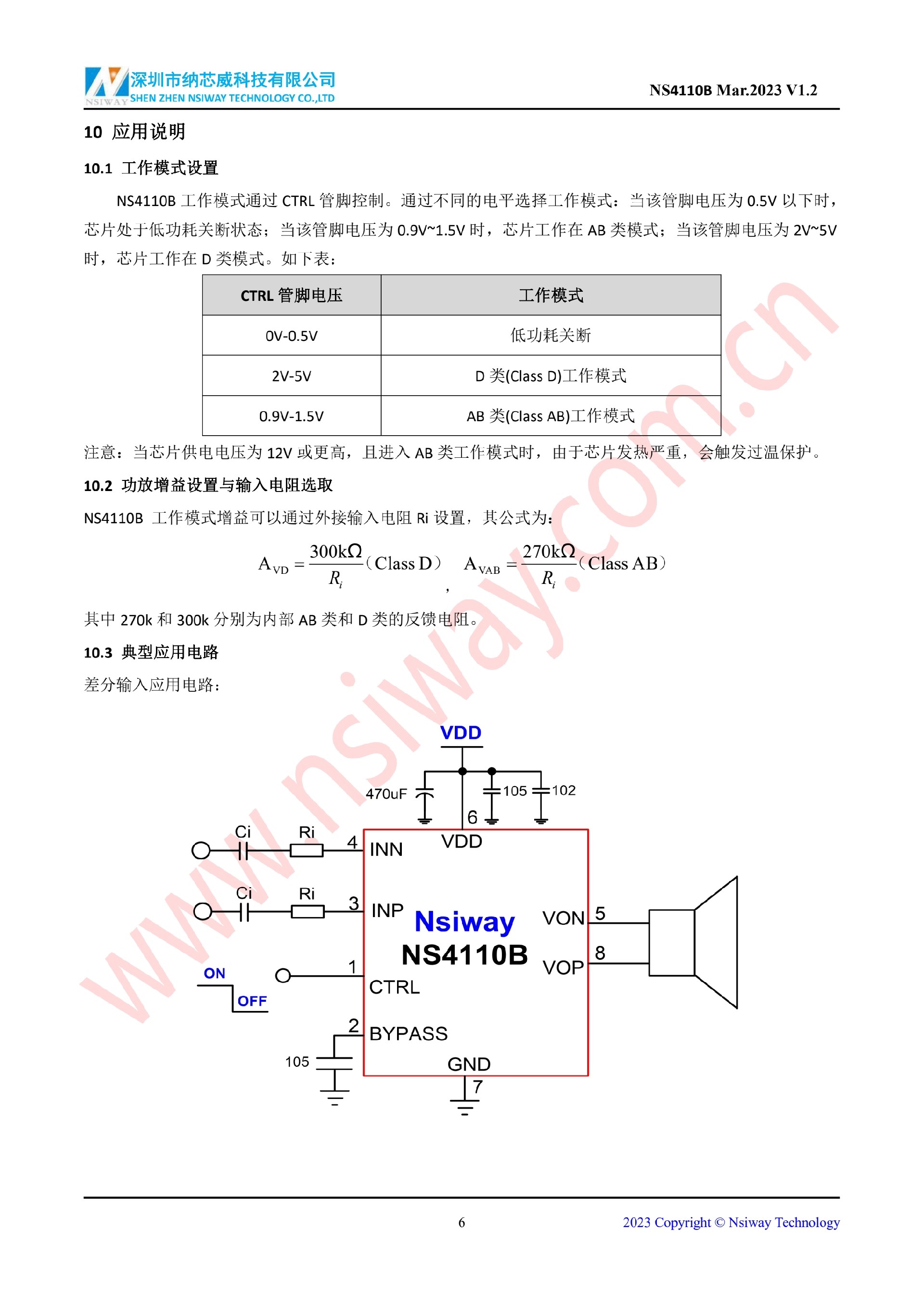 NS4110B 18W 單聲道 AB/D 類雙模音頻功率放大器