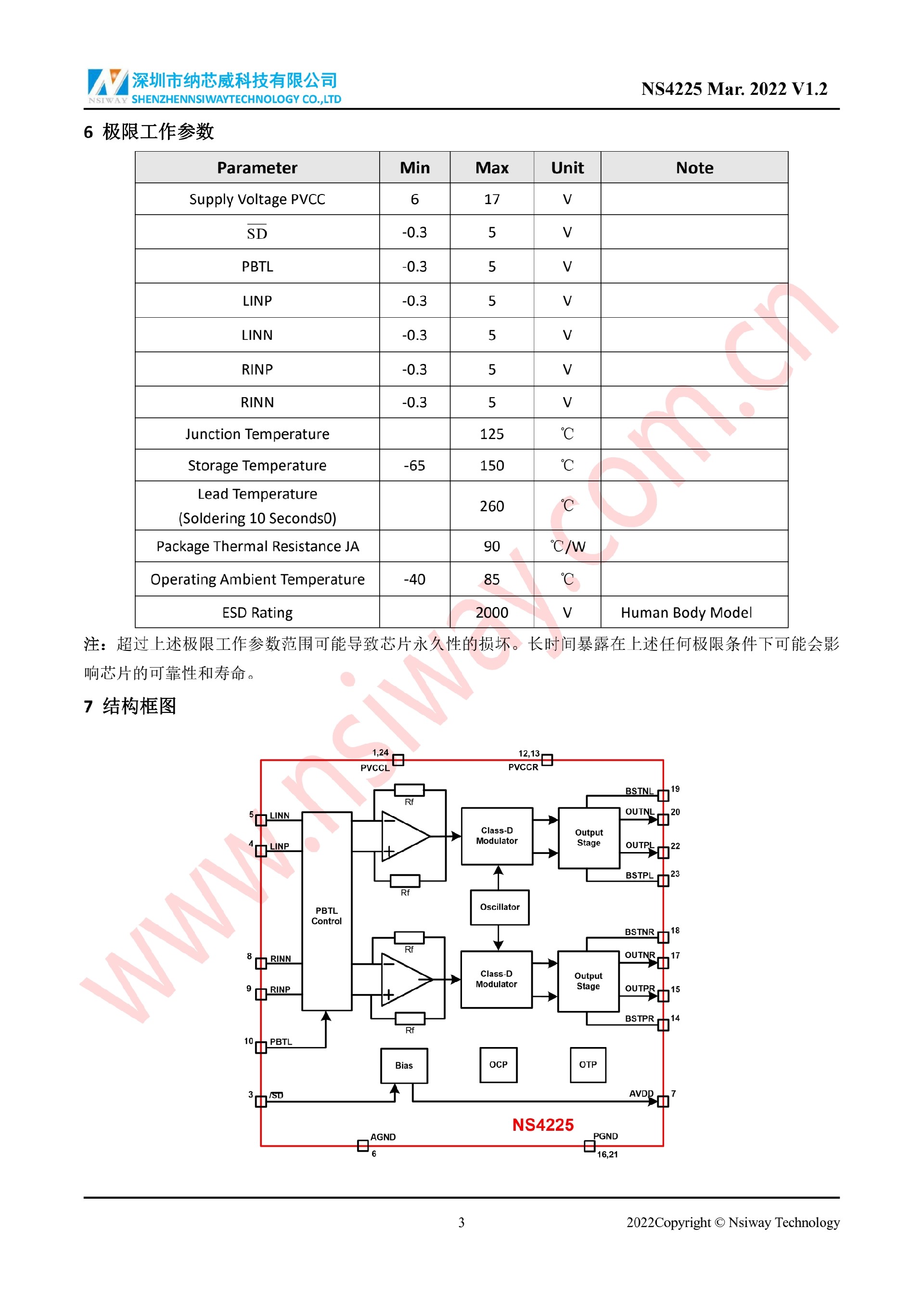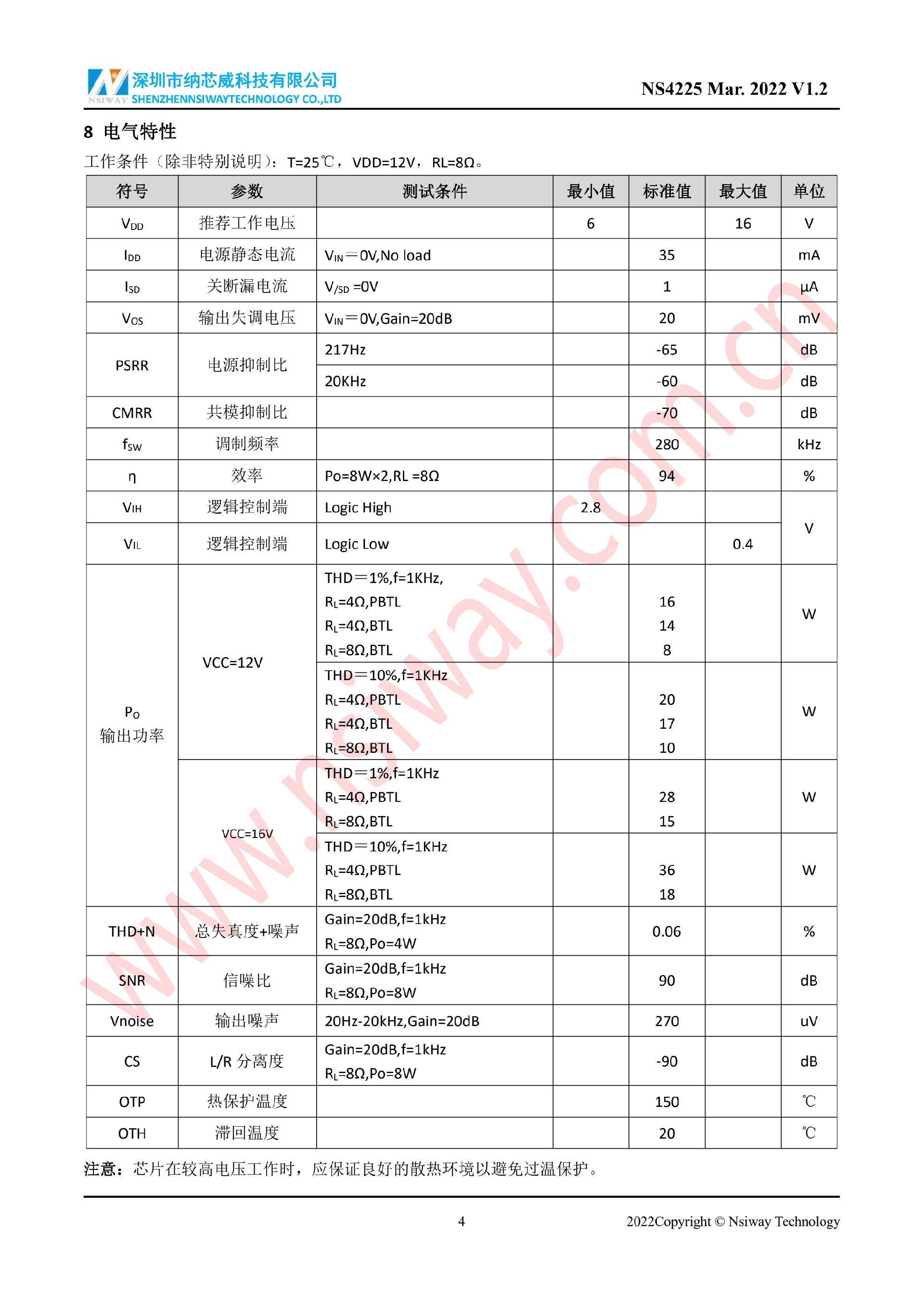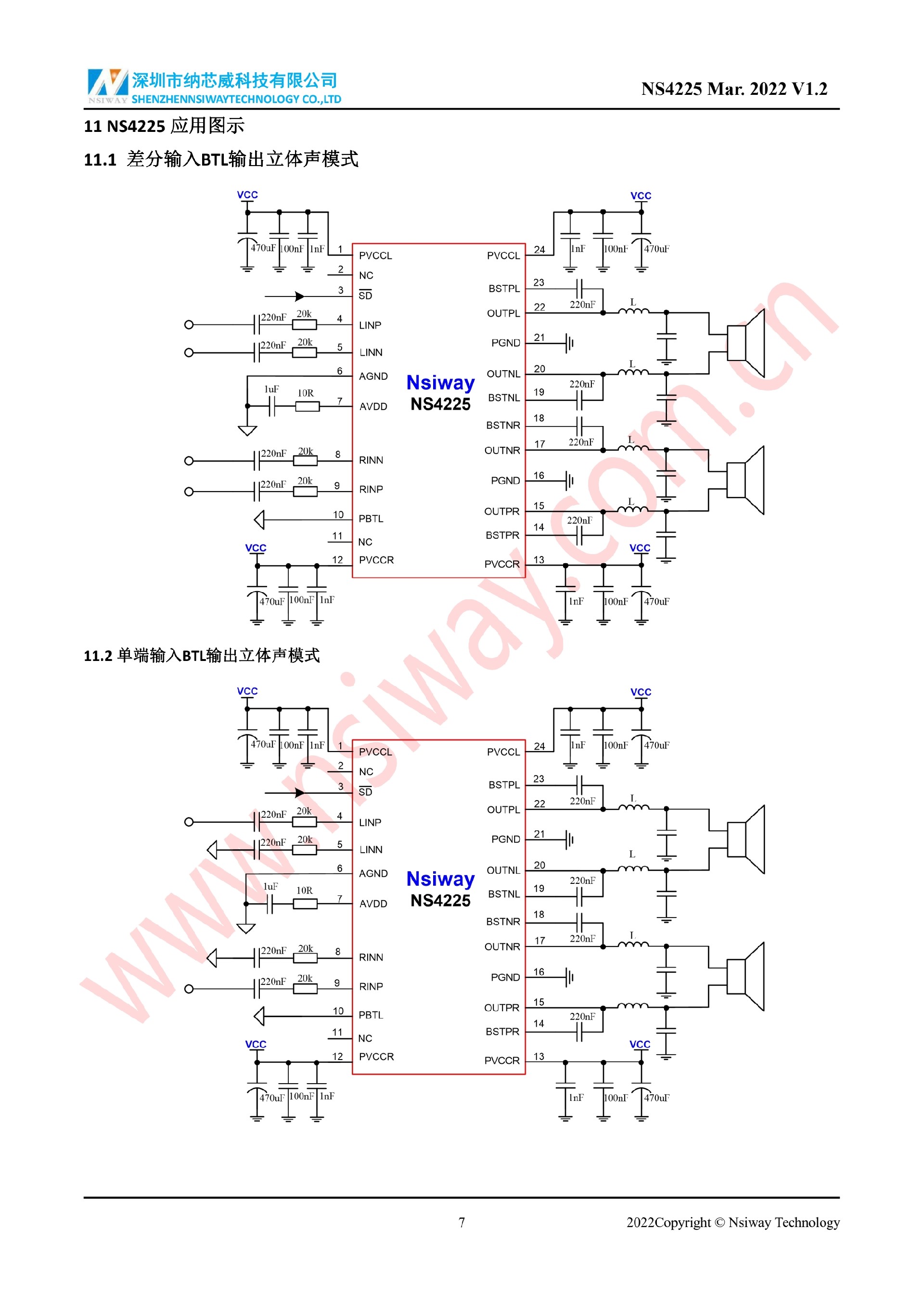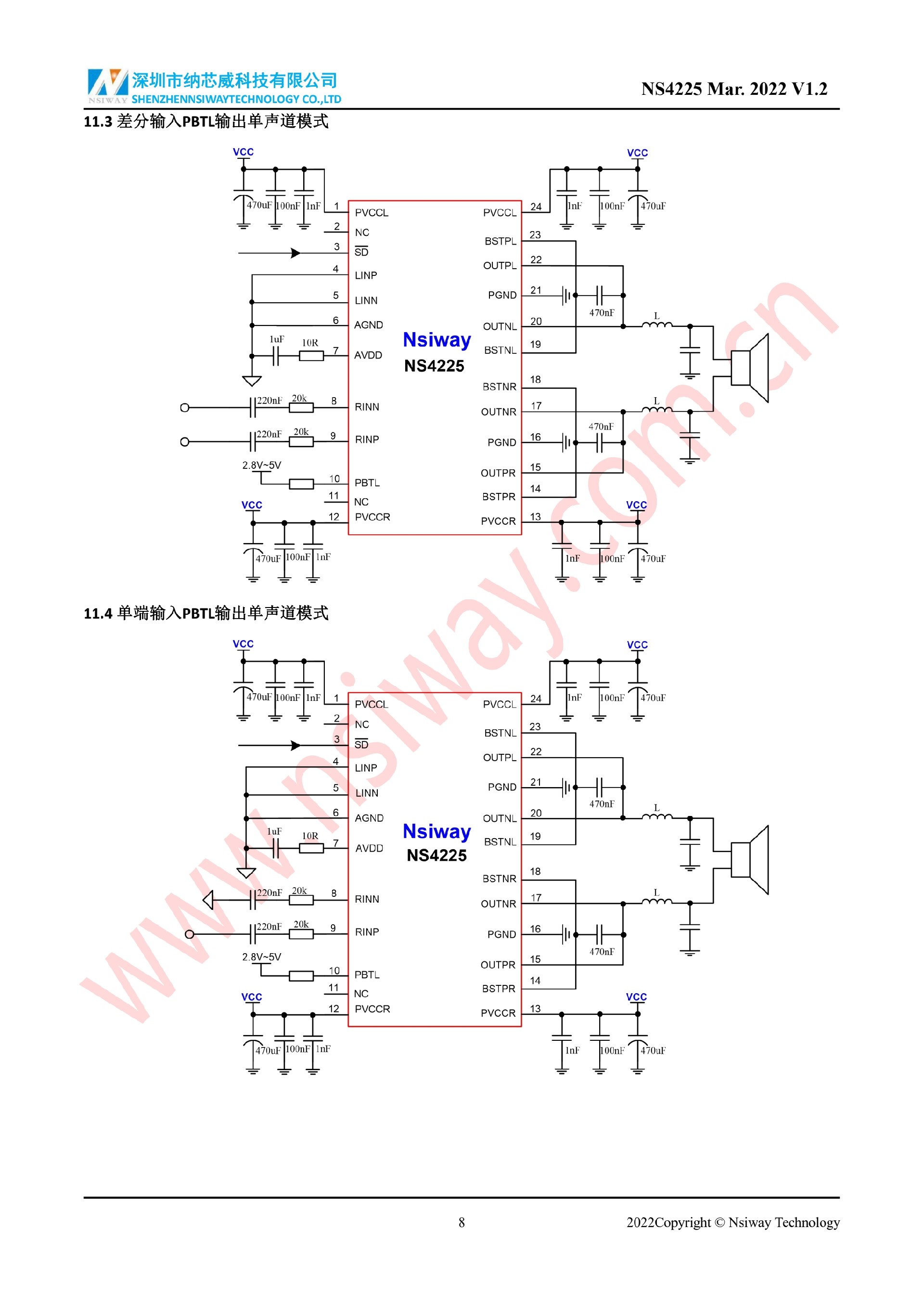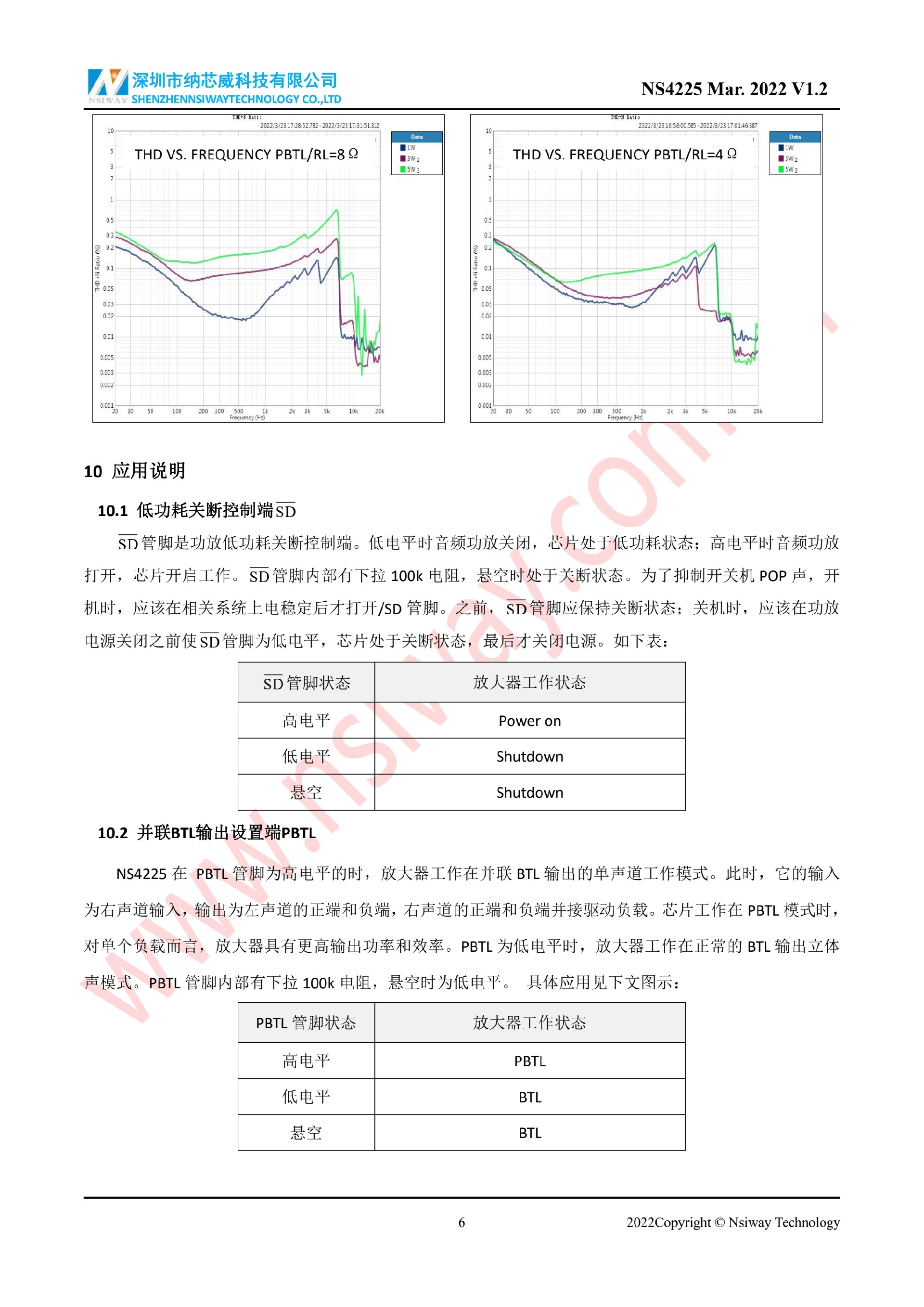 NS4225 20W×2 雙聲道 D 類音頻功率放大器附加 PBTL/BTL 功能